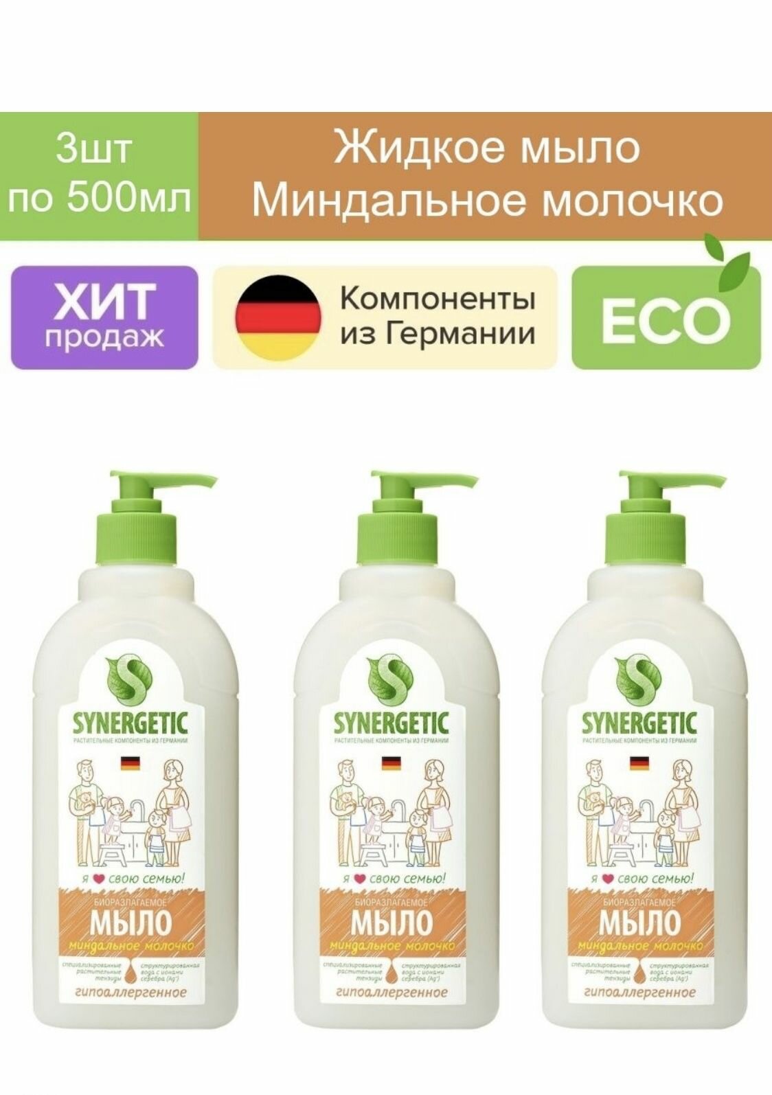 Купить Набор из 3 штук Мыло жидкое SYNERGETIC 500мл биоразлагаемое для мытья рук и тела Миндальное молочко