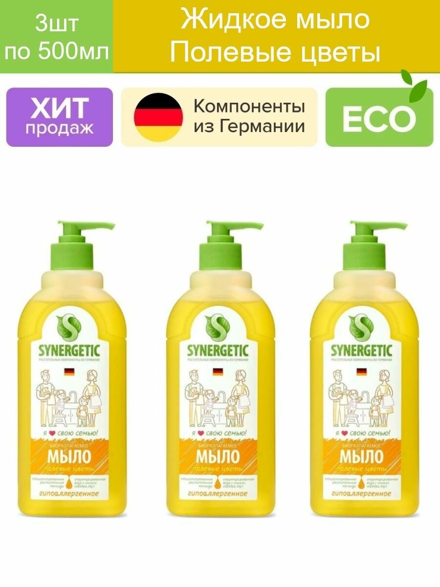 Купить Мыло жидкое Synergetic, флакон с дозатором 500мл, гипоалергенное Полевые цветы, 3шт