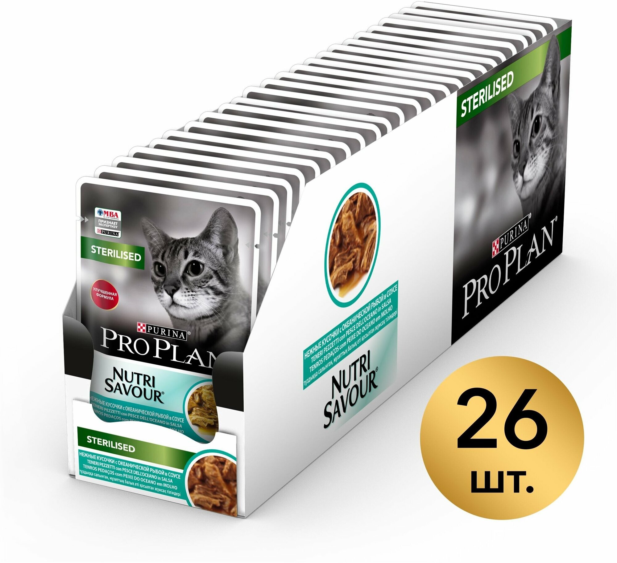 Pro Plan Nutrisavour Sterilised пауч для стерилизованных кошек и котов (кусочки в соусе) Океаническая рыба, 85 г. упаковка 26 шт