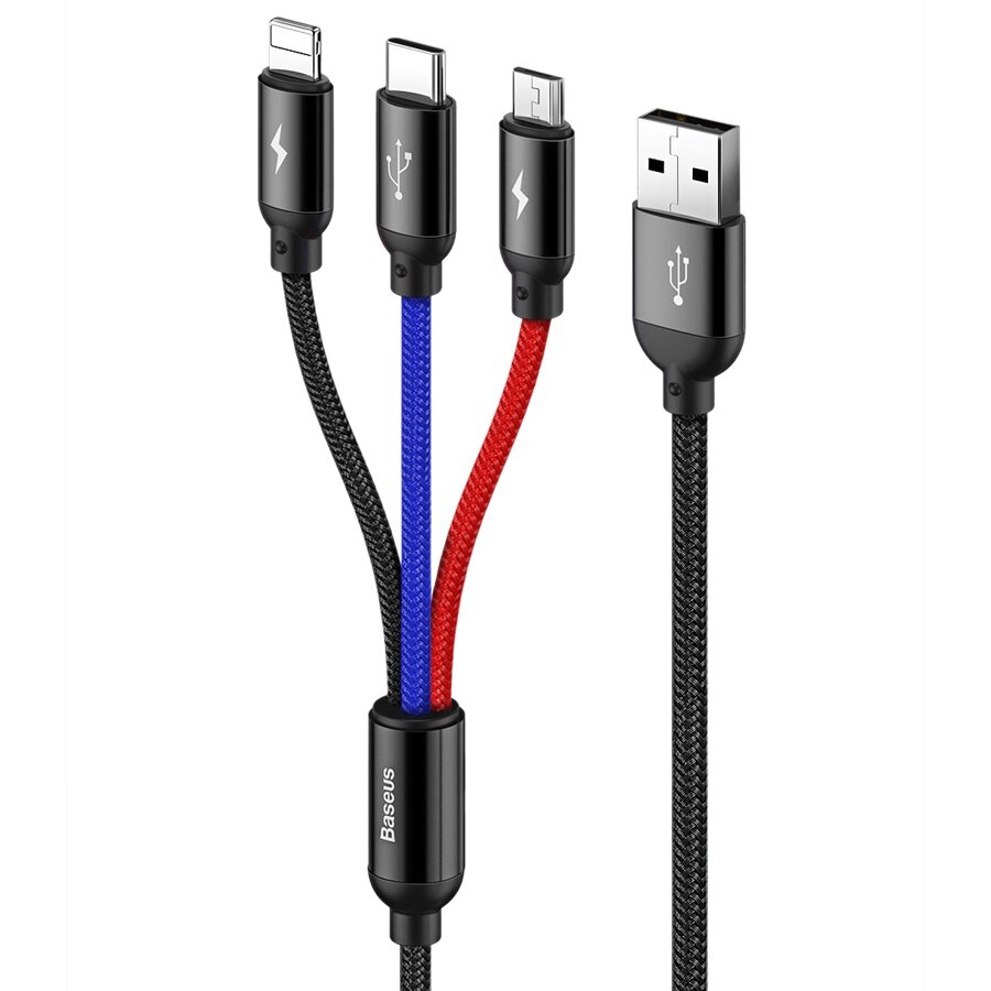 Купить Кабель USB BASEUS Three Primary Colors 3-in-1, USB - MicroUSB+Type-C+Lightning, 3.5A, 1.2 м, черный