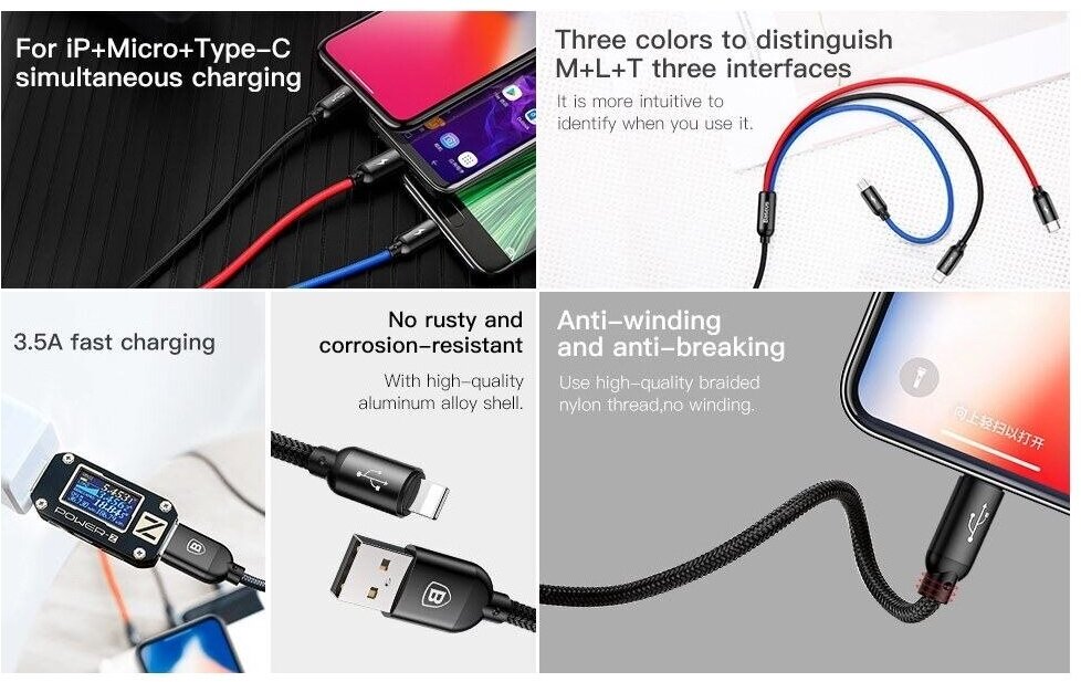 Ниже Вы можете прочитать отзывы на Кабель USB BASEUS Three Primary Colors 3-in-1, USB - MicroUSB+Type-C+Lightning, 3.5A, 1.2 м, черный, ознакомится с подробными характеристиками, посмотреть интересные обзоры и фотографии на Кабель USB BASEUS Three Primary Colors 3-in-1, USB - MicroUSB+Type-C+Lightning, 3.5A, 1.2 м, черный.