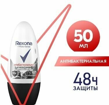 Rexona Дезодорант шариковый женский, Антибактериальная+невидимая на черной и белой одежде, 50 мл.