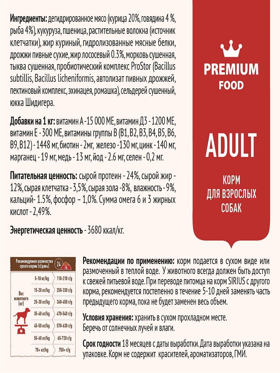 Сухой корм премиум класса SIRIUS для взрослых собак, мясной рацион, 15 кг