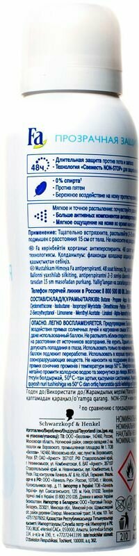 Ниже Вы можете прочитать отзывы на Fa Антиперспирант Прозрачная Защита, спрей, 150 мл, 1 шт., ознакомится с подробными характеристиками, посмотреть интересные обзоры и фотографии на Fa Антиперспирант Прозрачная Защита, спрей, 150 мл, 1 шт..