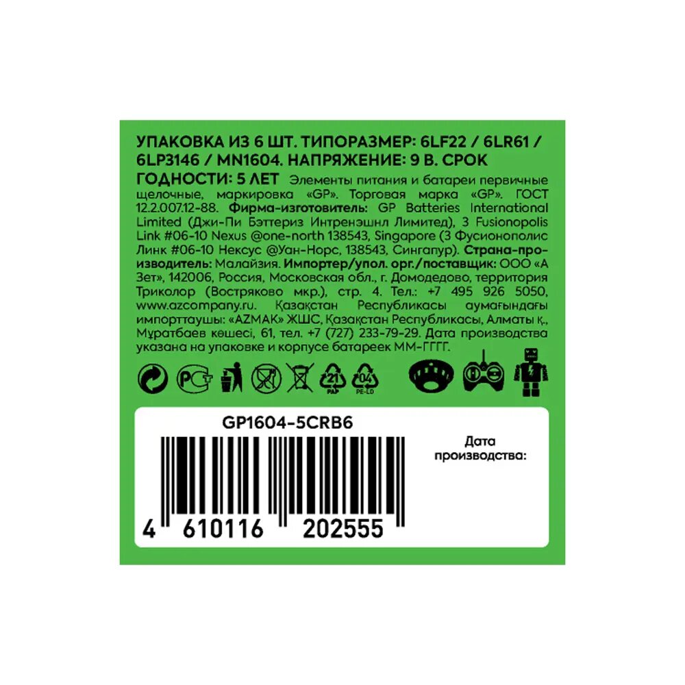 Батарейки GP 1604-5CRB6, 9V, (6LR61), 6 шт. в упаковке