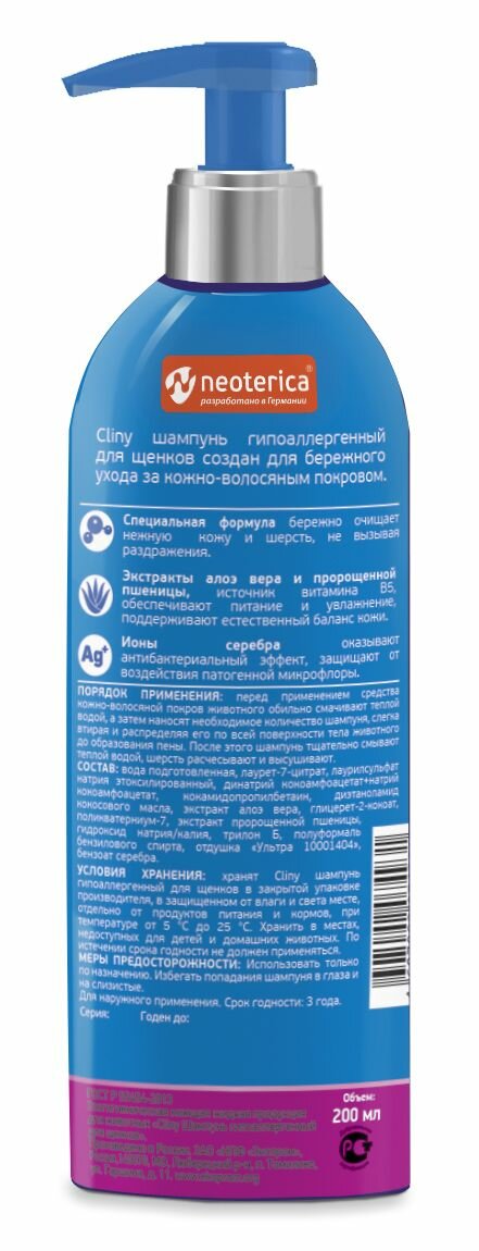 Шампунь Cliny (Neoterica) гипоаллергенный Бережная забота для щенков , 200 мл