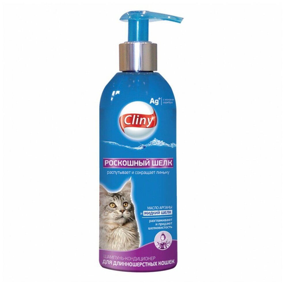 Купить Cliny Роскошный шелк, шампунь-кондиционер для длинношерстных кошек, 200 мл.