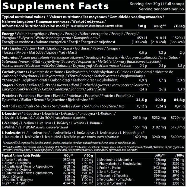 | Отзыв: | Отличное европейское качество. На 100гр - 85,3 Белка, 1,5-углеводов и 1,2- жира. Есть аминокислоты. Вкусы и шоколадные и фруктовые. |