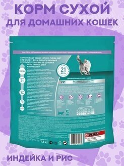 PURINA ONE 1,5 кг сухой корм для взрослых кошек с чувствительным пищеварением и разборчивым вкусом в еде, с высоким содержанием индейки и рисом