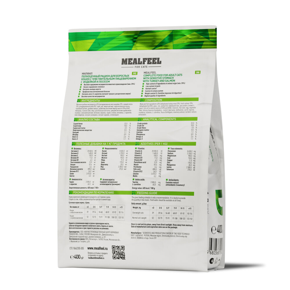 Купить Mealfeel Корм сухой для кошек с чувствительным пищеварением, с индейкой и лососем, 400 гр.