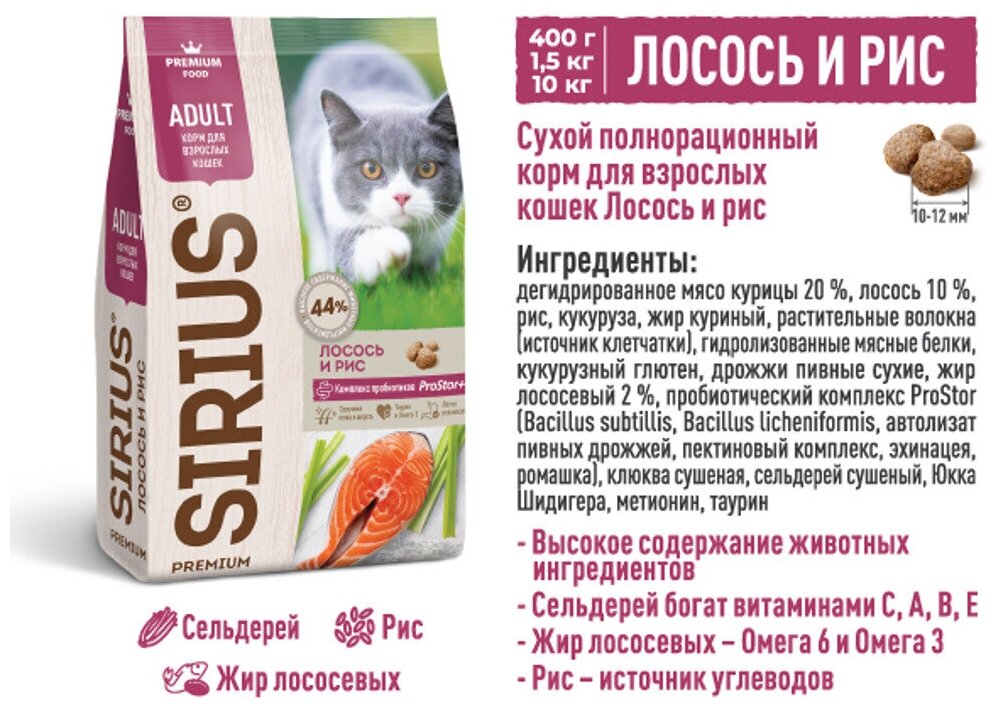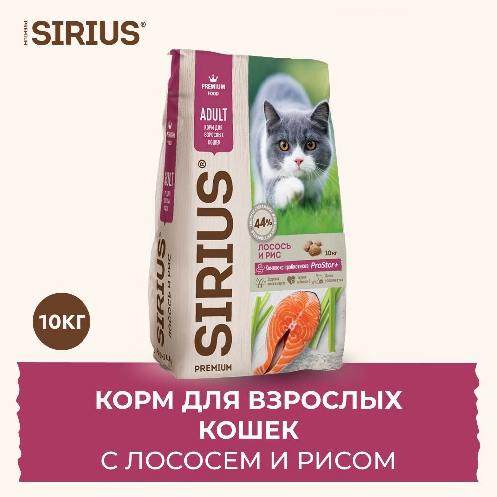 Сухой корм сириус SIRIUS PREMIUM для взрослых кошек, лосось и рис, 10 кг