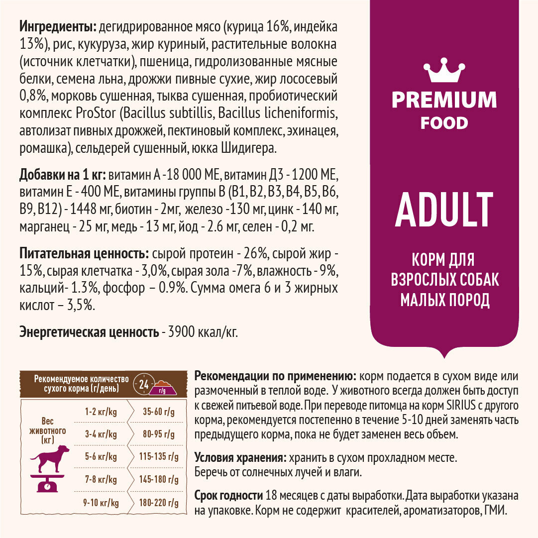 SIRIUS для взрослых собак маленьких пород с индейкой (2 кг)