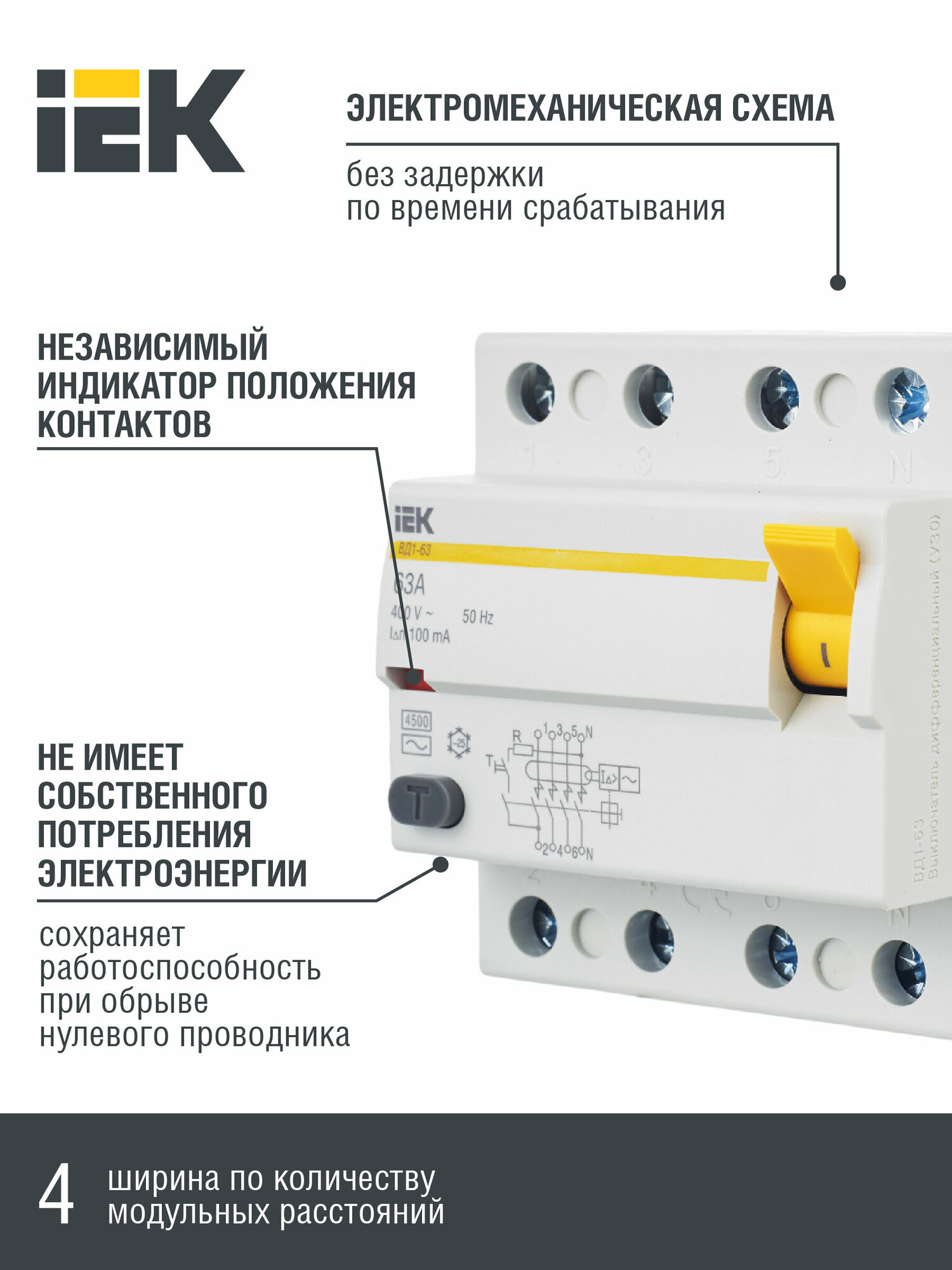 УЗО IEK ВД1-63 3P N 80 A 100 мА 4.5 кА AC MDV10-4-080-100