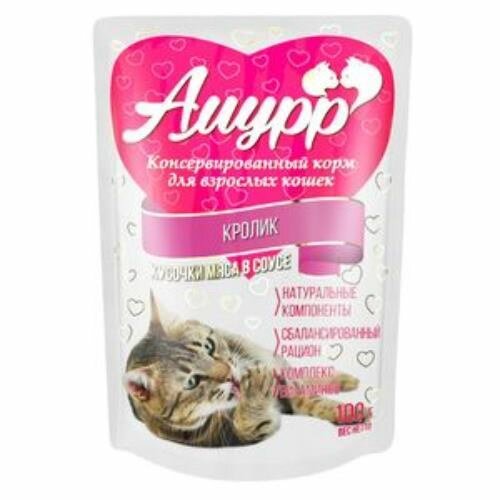 Амурр 100г Консервы для кошек кусочки мяса в соусе кролик пауч 24х100г