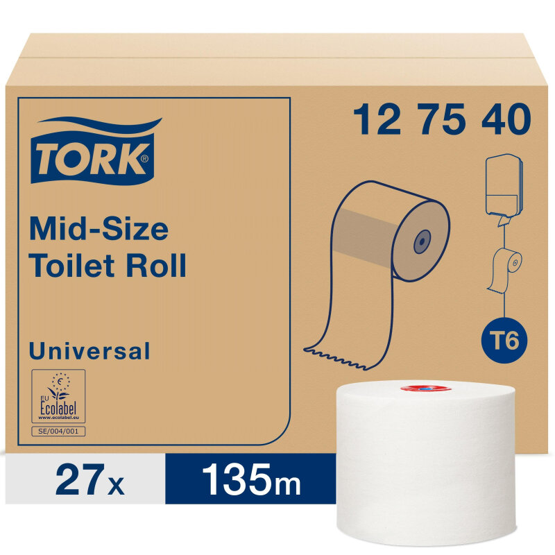 Бумага туалетная в рулонах Tork Mid-size Universal T6 1-слойная 27 рулонов по 135 метров (артикул производителя 127540)