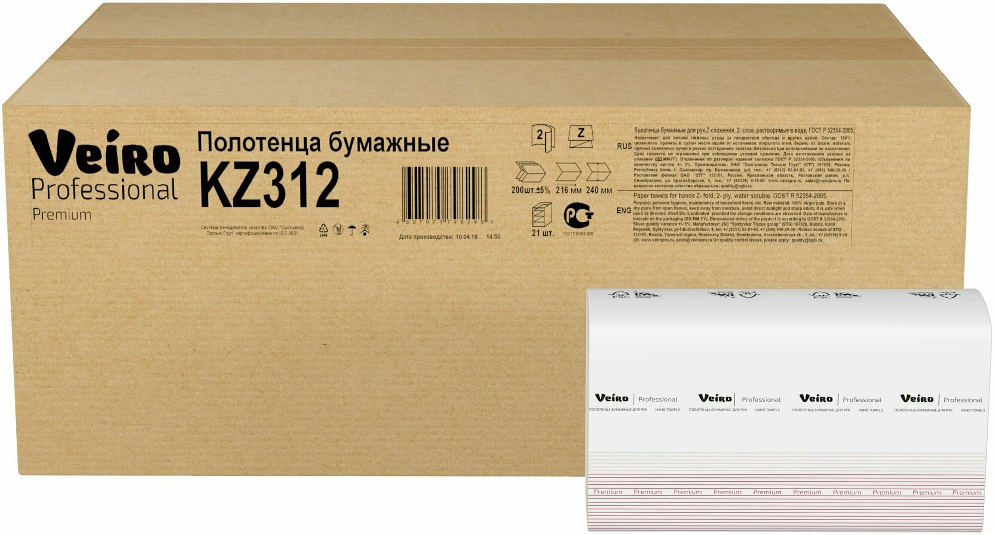 KZ312 Бумажные полотенца в пачках Veiro Professional Premium белые двухслойные растворимые (21 пач х 200 л)