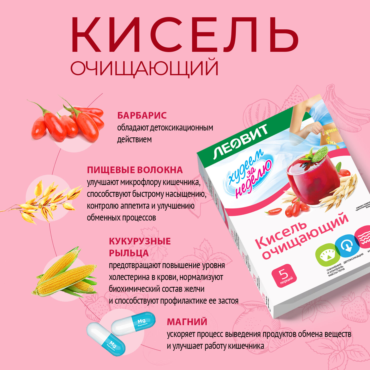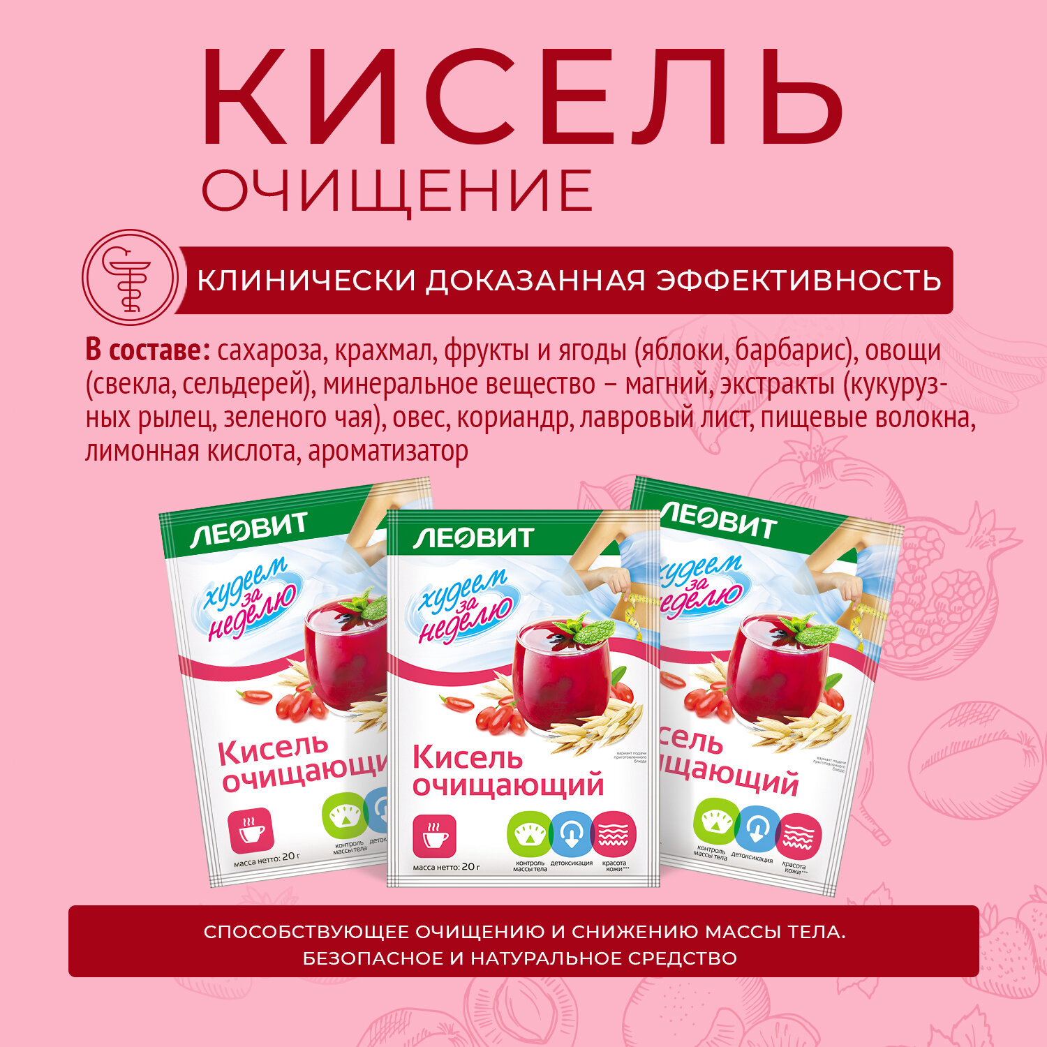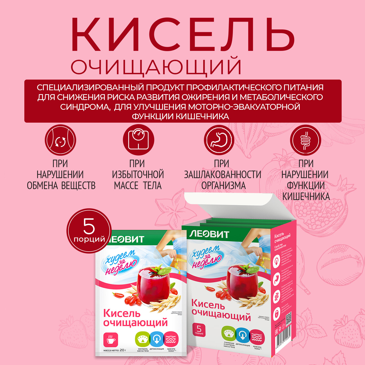 Кисель леовит Очищающий. 5 пакетов по 20 г. Упаковка 100 г