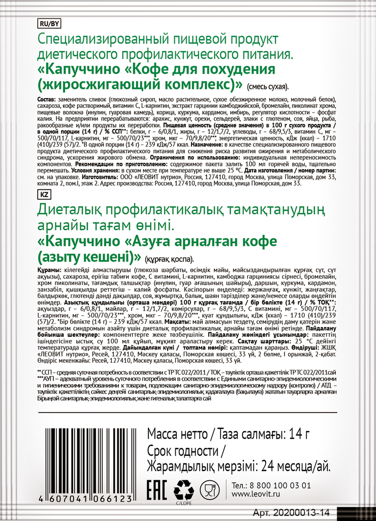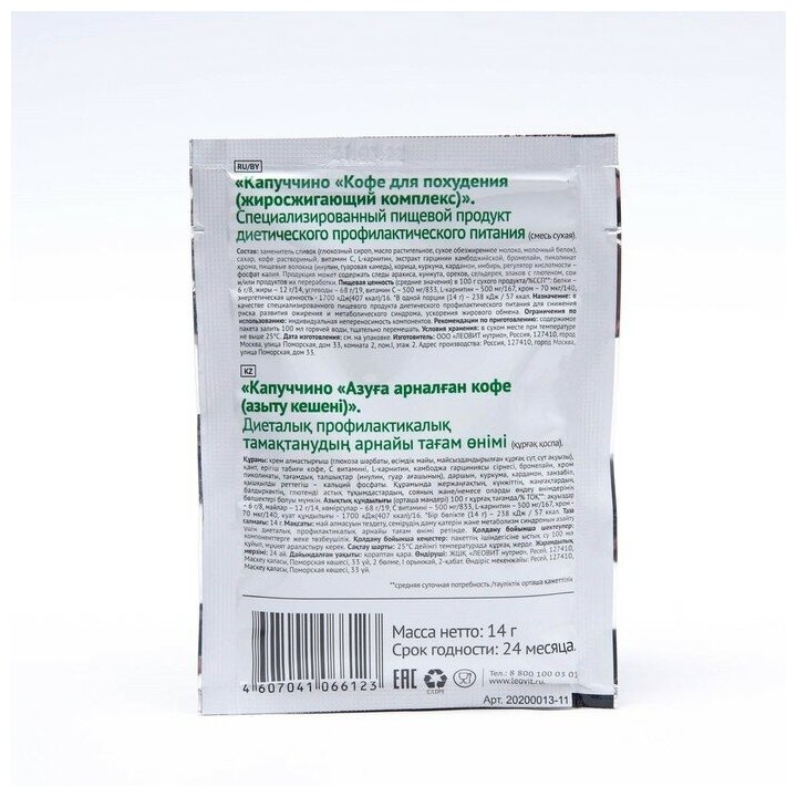 Леовит Капуччино (жиросжигающий комплекс). 7 пакетов по 14 г.