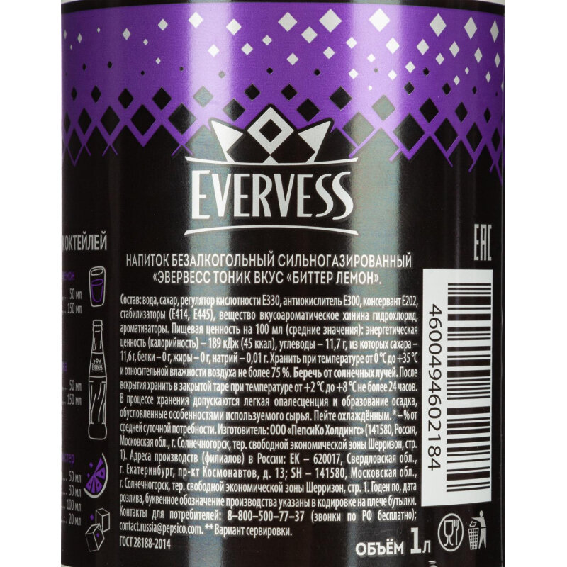 Напиток Evervess Tonic club Биттер Лемон газированный пэт 1л 12шт/уп интересное: