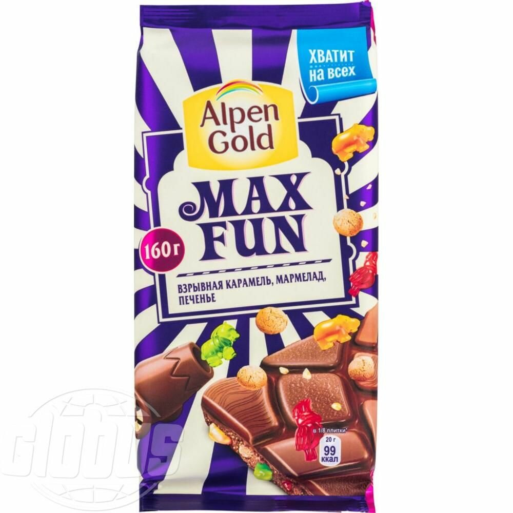 Шоколад ALPEN GOLD (альпен гольд) MaxFun молочный начинка взрывная карамель, мармелад, печенье 150г