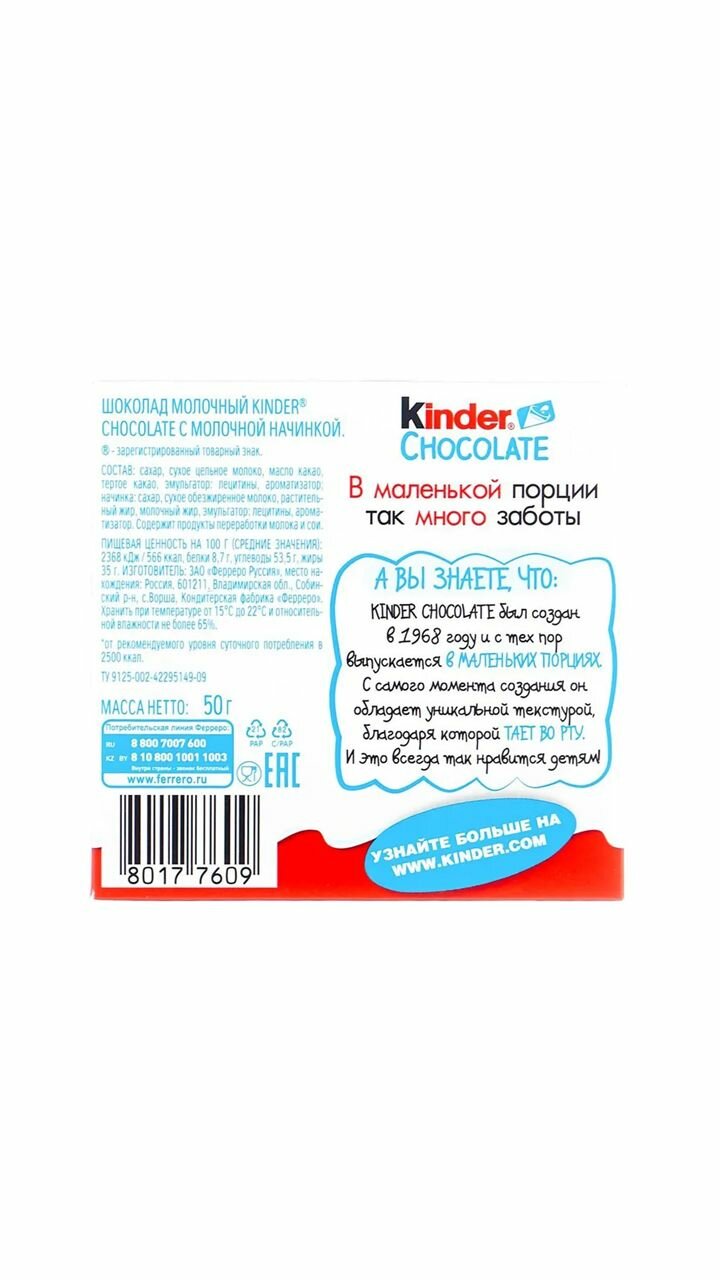 Ниже Вы можете прочитать отзывы на Шоколад Kinder Chocolate молочный, порционный, 50 г, 4 шт. в уп., 20 уп., ознакомится с подробными характеристиками, посмотреть интересные обзоры и фотографии на Шоколад Kinder Chocolate молочный, порционный, 50 г, 4 шт. в уп., 20 уп..