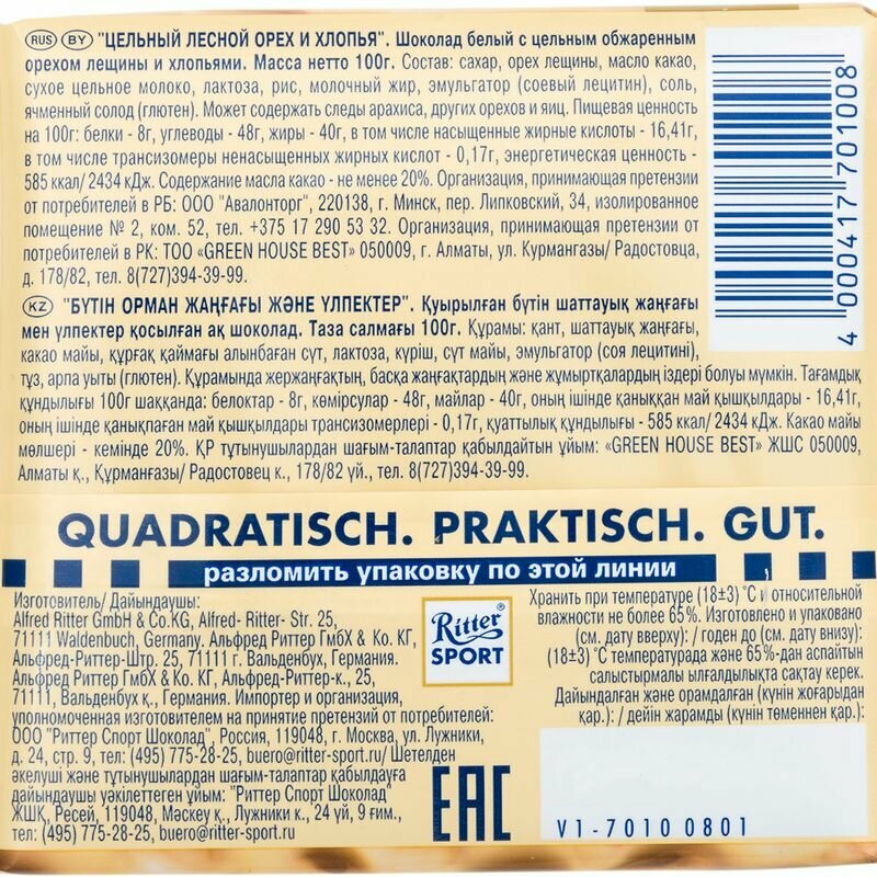 Шоколад Ritter Sport белый Цельный лесной орех и хлопья, 100г
