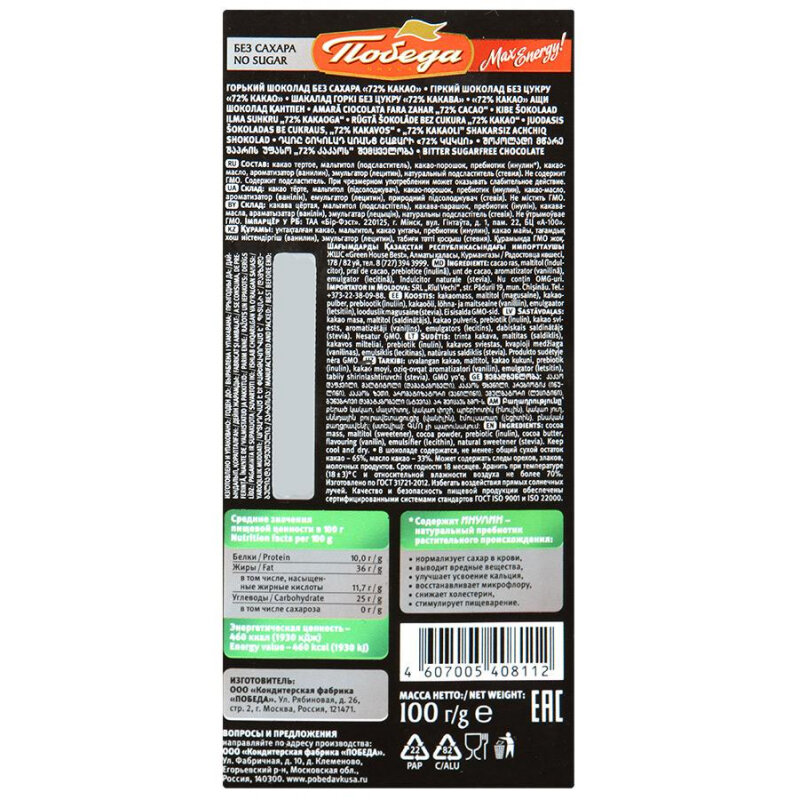 Купить Шоколад Победа Вкуса Горький без сахара 72% какао,100г
