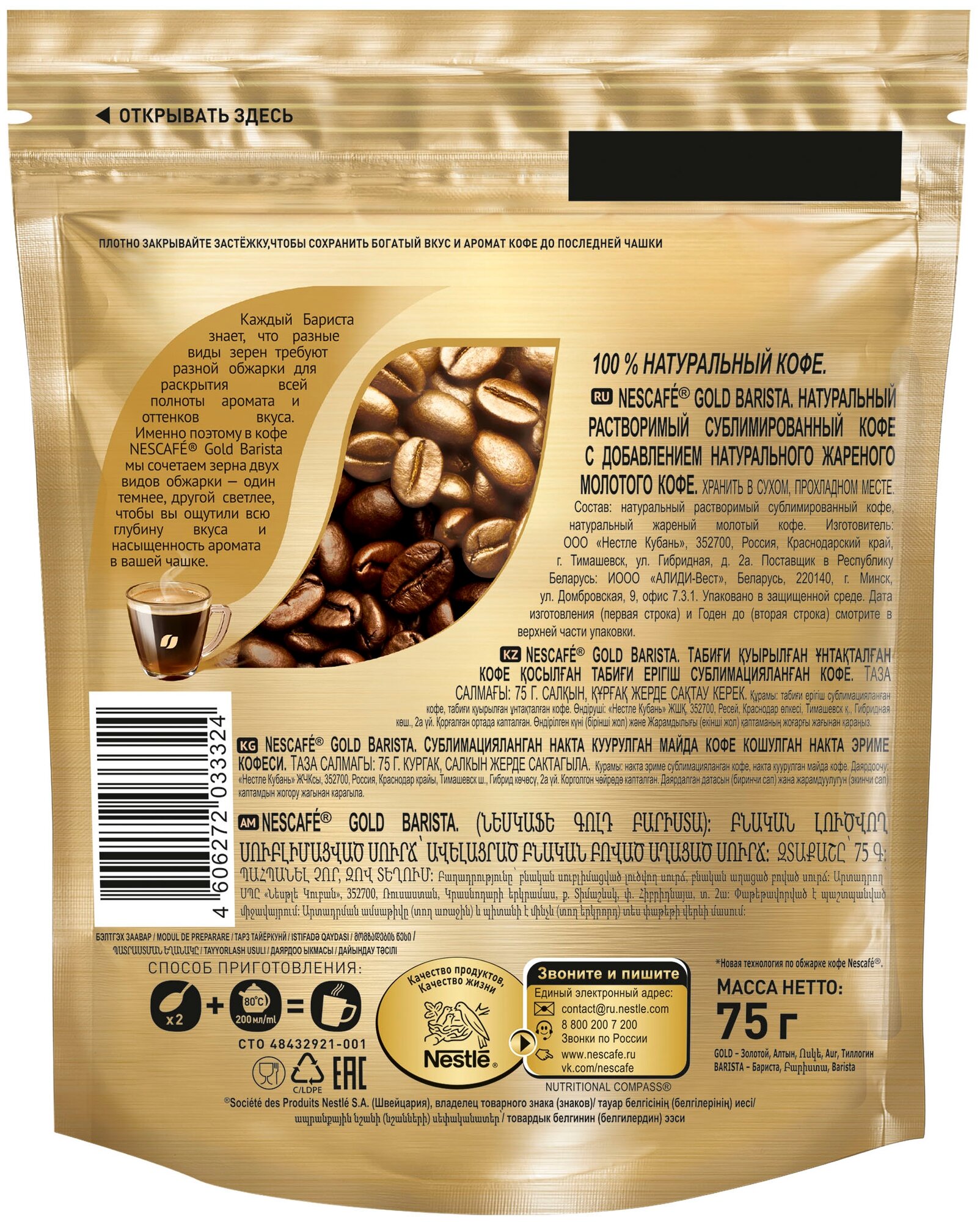 NESCAFE GOLD Barista Кофе натуральный растворимый сублимированный с добавлением натурального жаренного молотого кофе 75 г