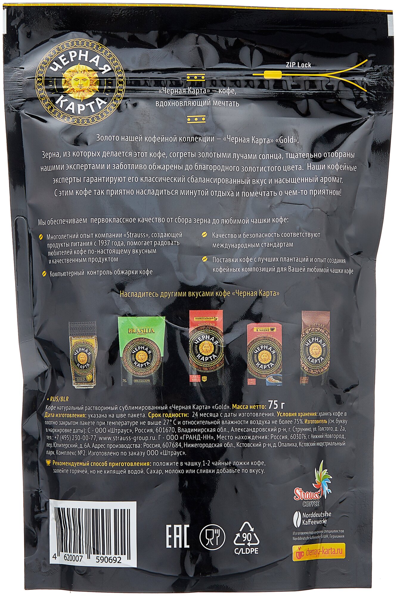 Кофе растворимый Черная карта Gold, пакет, 75 г