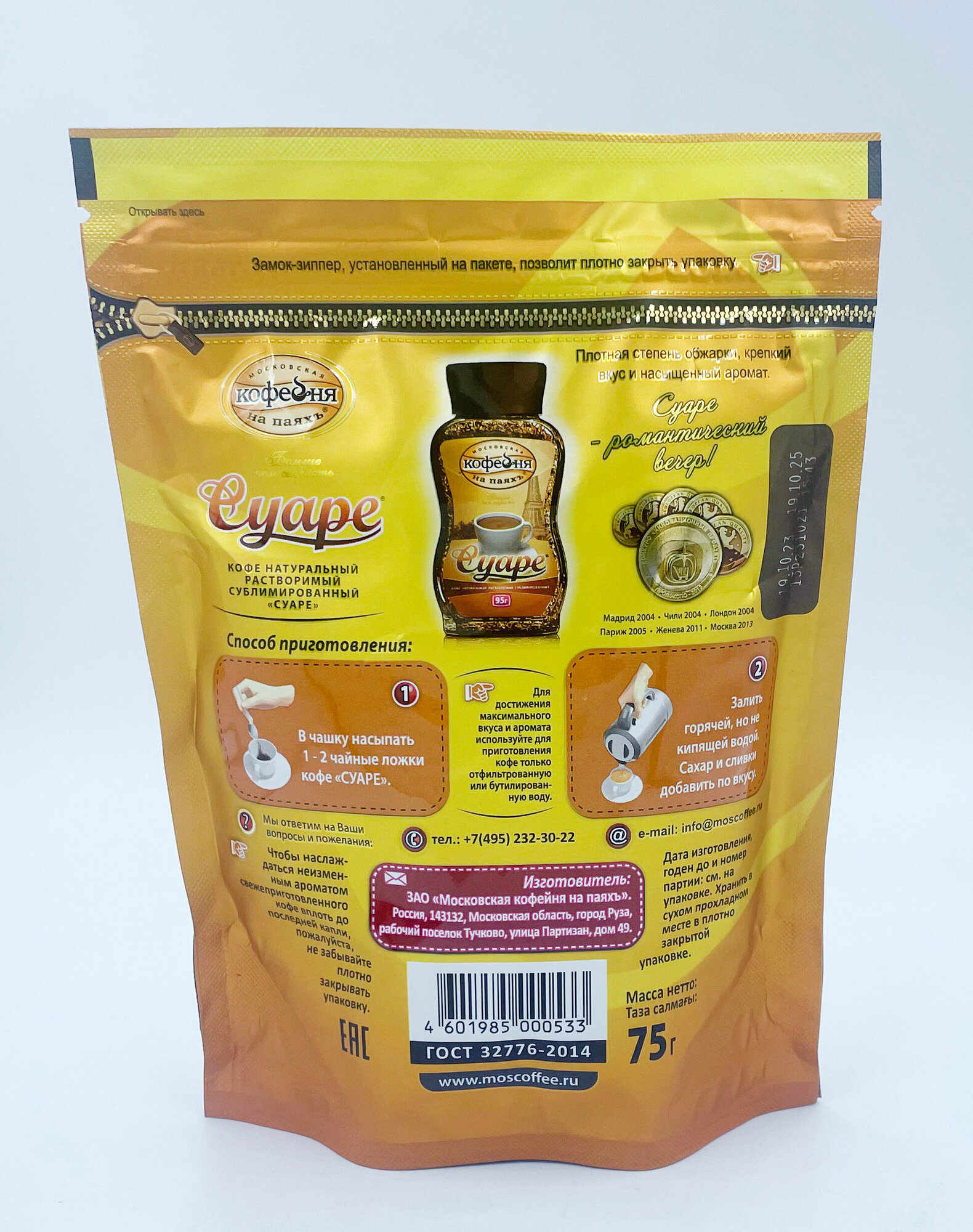Кофе растворимый Суаре Московская кофейня на паяхъ, вакуумная упаковка, 75 г