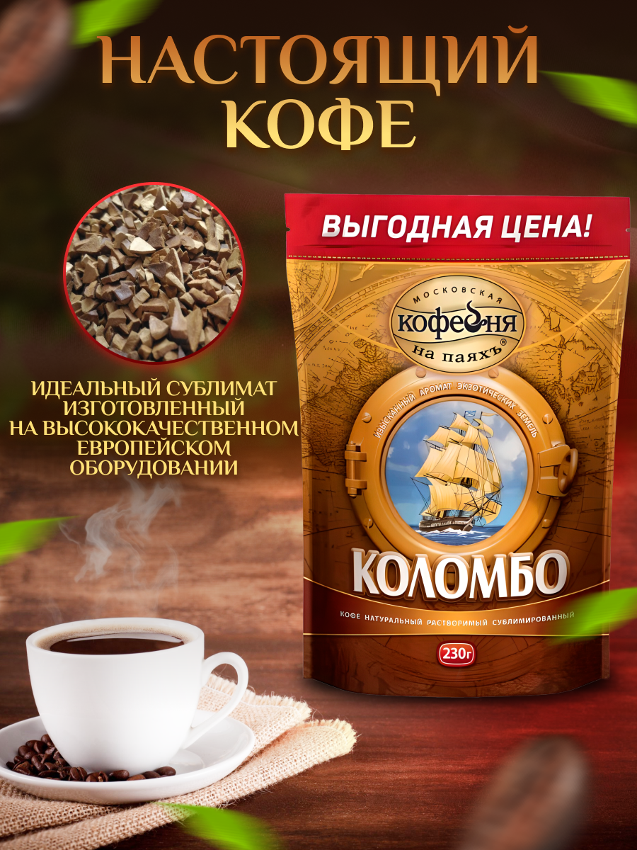 Ниже Вы можете прочитать отзывы на Кофе растворимый сублимированный Московская кофейня на паяхъ Коломбо пакет 230 г, ознакомится с подробными характеристиками, посмотреть интересные обзоры и фотографии на Кофе растворимый сублимированный Московская кофейня на паяхъ Коломбо пакет 230 г.