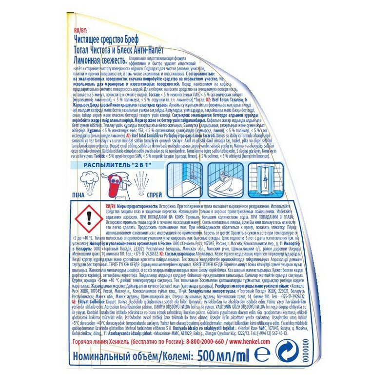 Бреф / Bref Total - Спрей универсальный Анти-налет Чистота и Блеск Лимонная свежесть 500 мл