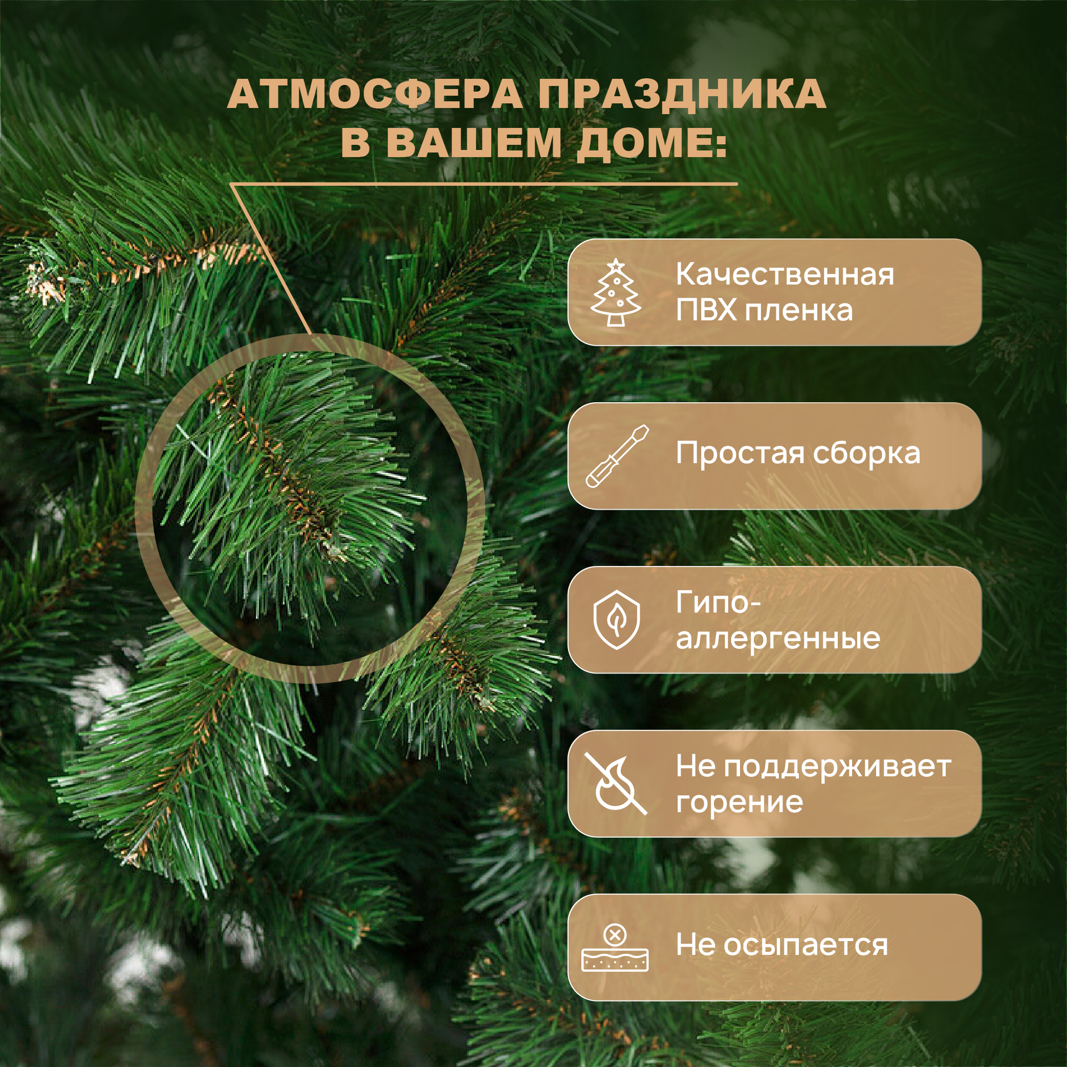 «Хвоя» пушистая, глубокого зелёного цвета. Ветки достаточно крепкие, не прогибаются под весом стеклянных и фарфоровых игрушек. |