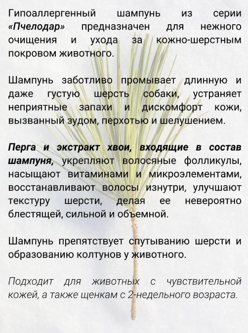 СохранитьPchelodar (Пчелодар) шампунь с пергой и экстрактом хвои для длинношерстных собак, 250 мл интересное: