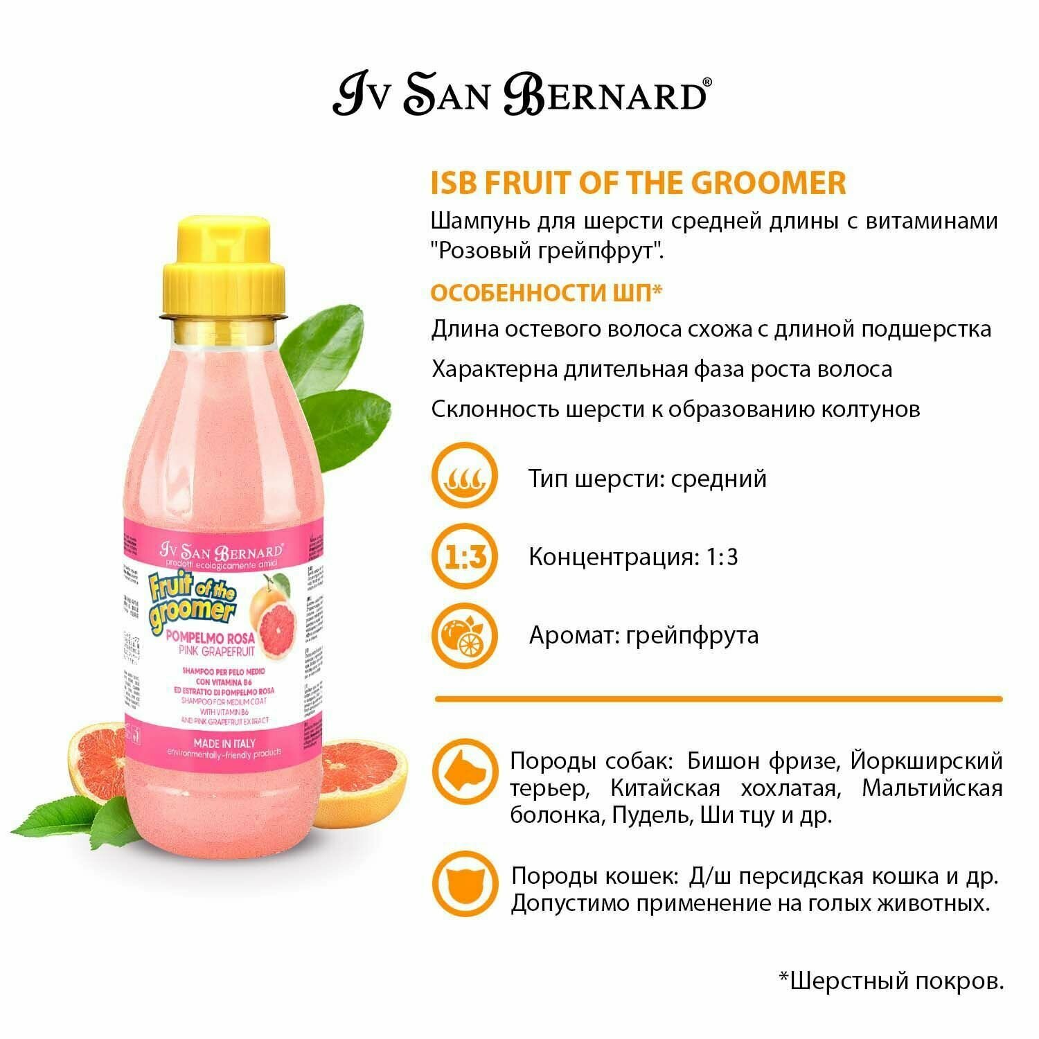 Шампунь -шампунь Iv San Bernard Fruit of the Groomer Pink Grapefruit для кошек и собак с шерстью средней длины с витаминами , 500 мл , 550 г