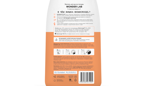 | Способ применения | Нанесите небольшое количество геля WONDER LAB на губку или щетку. Помойте посуду как обычно. Ополосните водой. Добавляйте гель по мере необходимости. Подходит для мытья овощей и фруктов. |