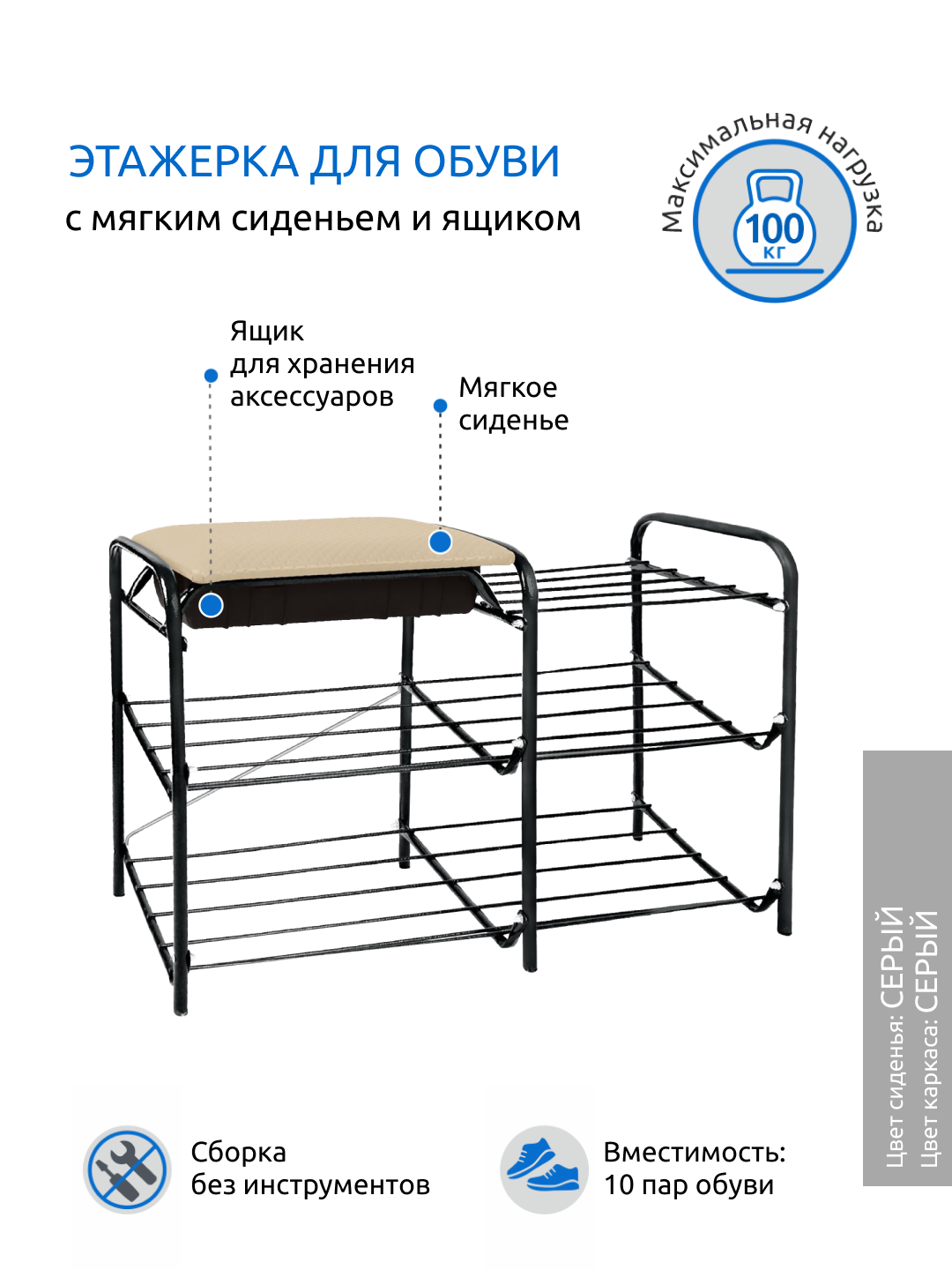 Не определен Этажерка для обуви с сиденьем (ЭТП3/С), 2 полки, 79×33×52,2 см, цвет серый