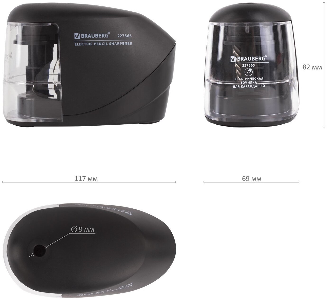 Точилка электрическая (электроточилка) для карандашей с контейнером для стружки, питание от сети 220В/4 батарейки АА, фрезерный механизм, Brauberg