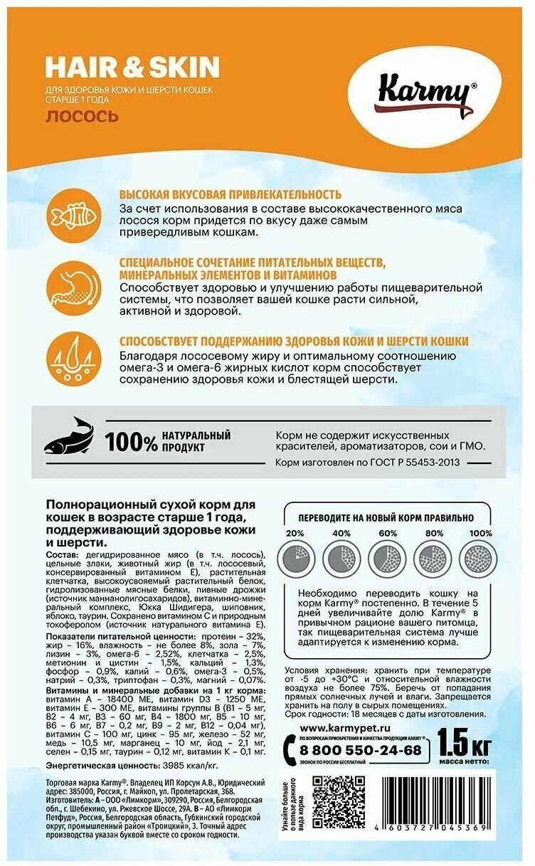 Корм Karmy Hair & Skin для кошек, поддерживающий здоровье кожи и шерсти, с лососем, 1.5 кг