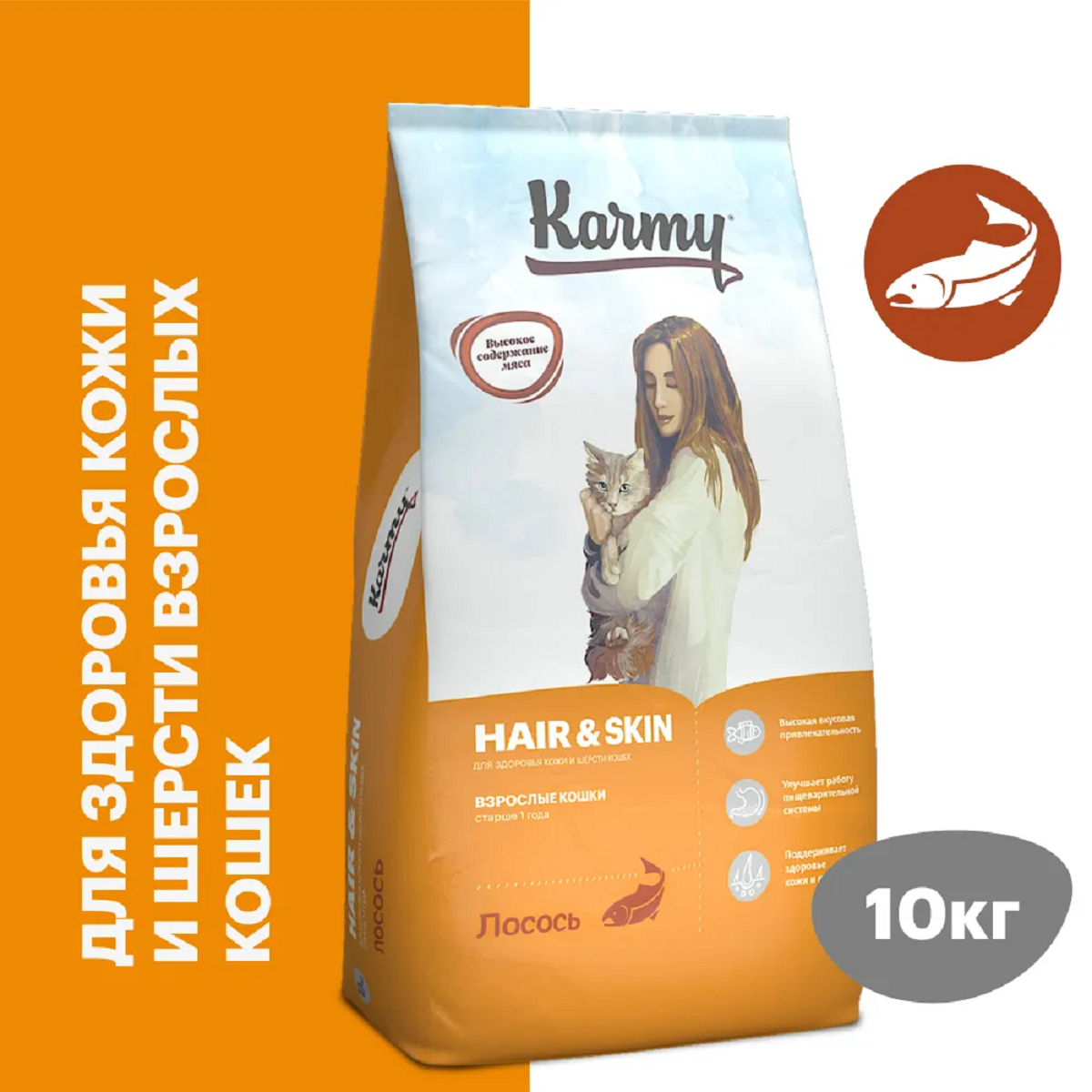 KARMY HAIR & SKIN. Корм для взрослых кошек старше 1 года, поддерживающий здоровье кожи и шерсти. Лосось (10 кг)