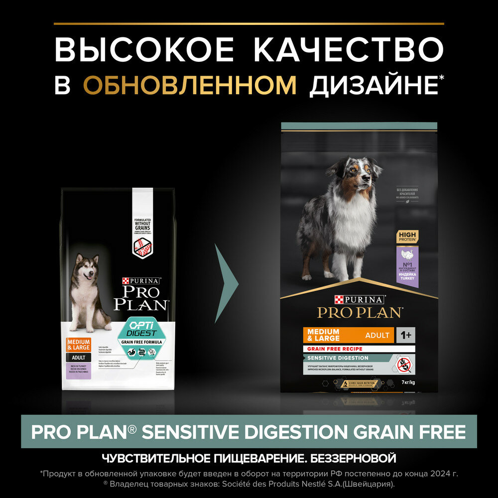 Pro Plan Grain Free Medium&Large корм для взрослых собак средних пород с чувствительным пищеварением Индейка, 7 кг.