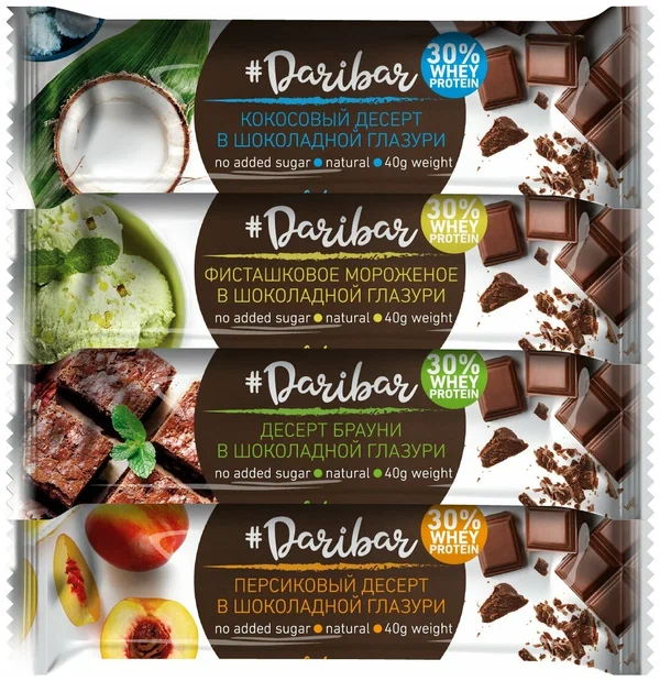 Купить Ассорти протеиновых батончиков Dari Bar (Кокосовый десерт х 6шт., Персиковый десерт х 7шт., Десерт брауни х 6шт., Фисташковое мороженное х 6шт.), 25 шт.