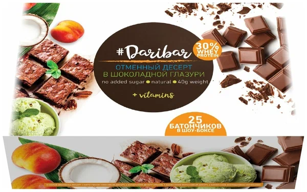 Шоу-бокс изделие кондитерское "Батончик Dari Bar" 30% белка, со вкусом Кокосовый десерт в шоколадной глазури, 25 шт. x 40 гр.