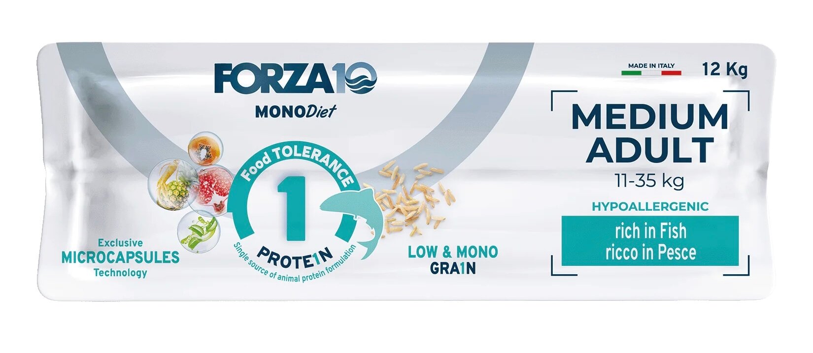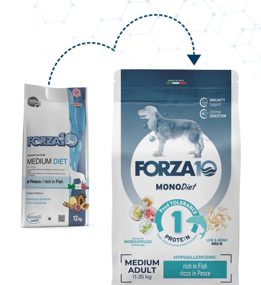 Корм Forza10 Diet Medium (гипоаллергенный) для собак средних пород при пищевой аллергии, с рыбой (с микрокапсулами), 12 кг