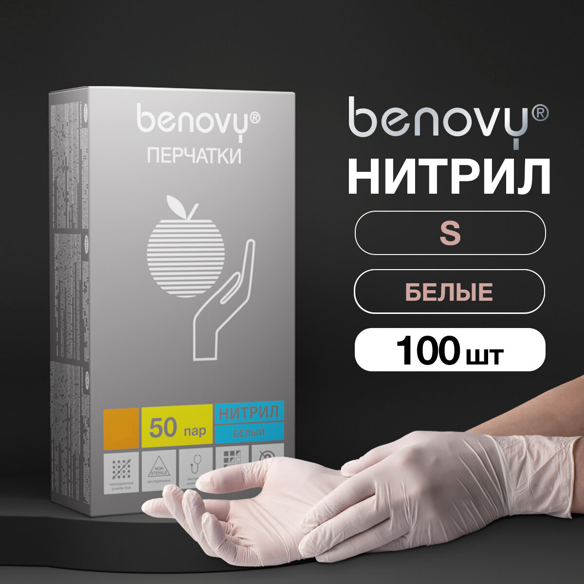 Перчатки медицинские Benovy, нитрил, нестерильные, текстурированные на пальцах, белые, размер S, 100 пар, 100 штук