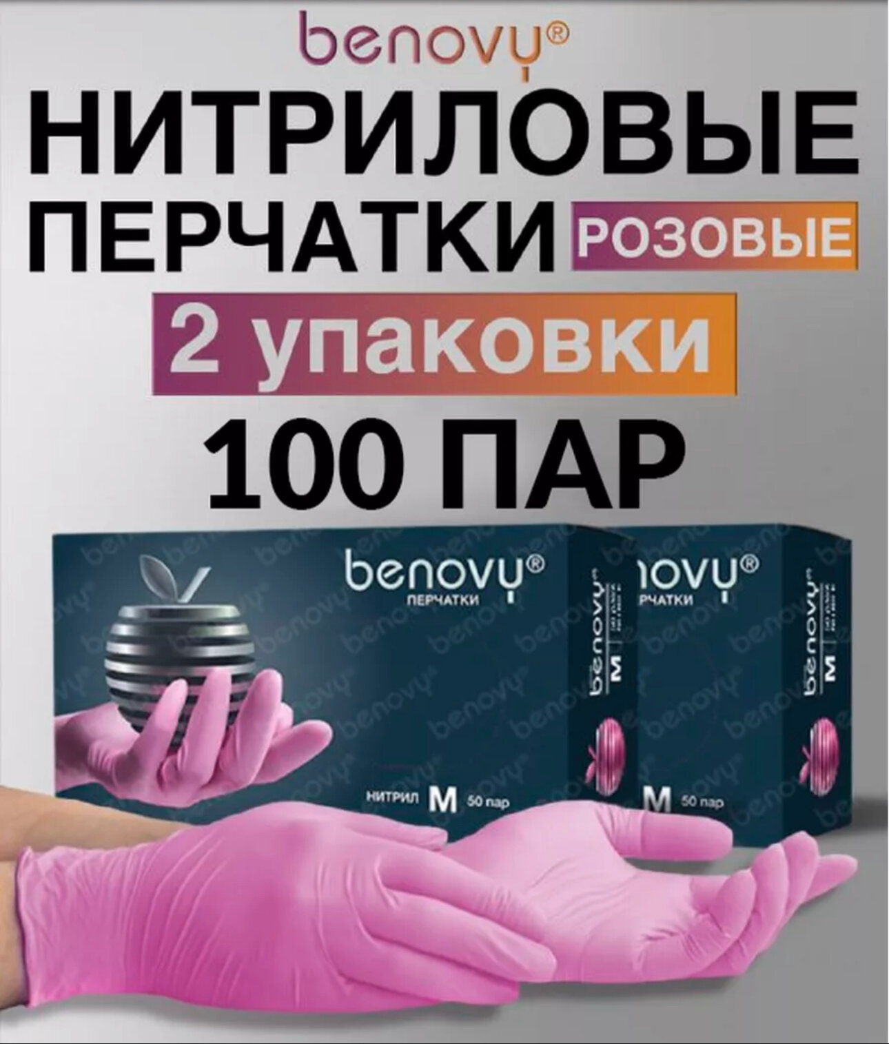 Перчатки нитриловые Benovy (розовые, размер L, 100 штук)
