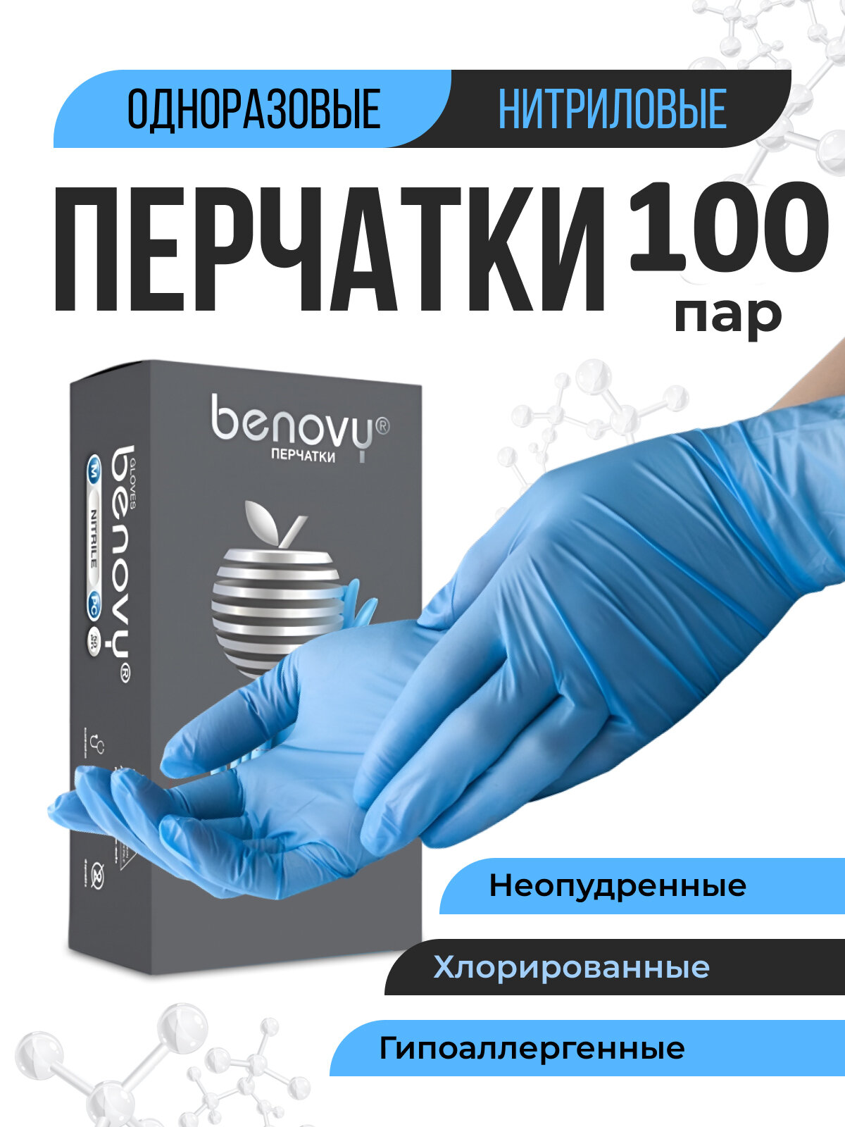 "Перчатки нитриловые Benovy (голубые), L, 100 шт/50 пар."