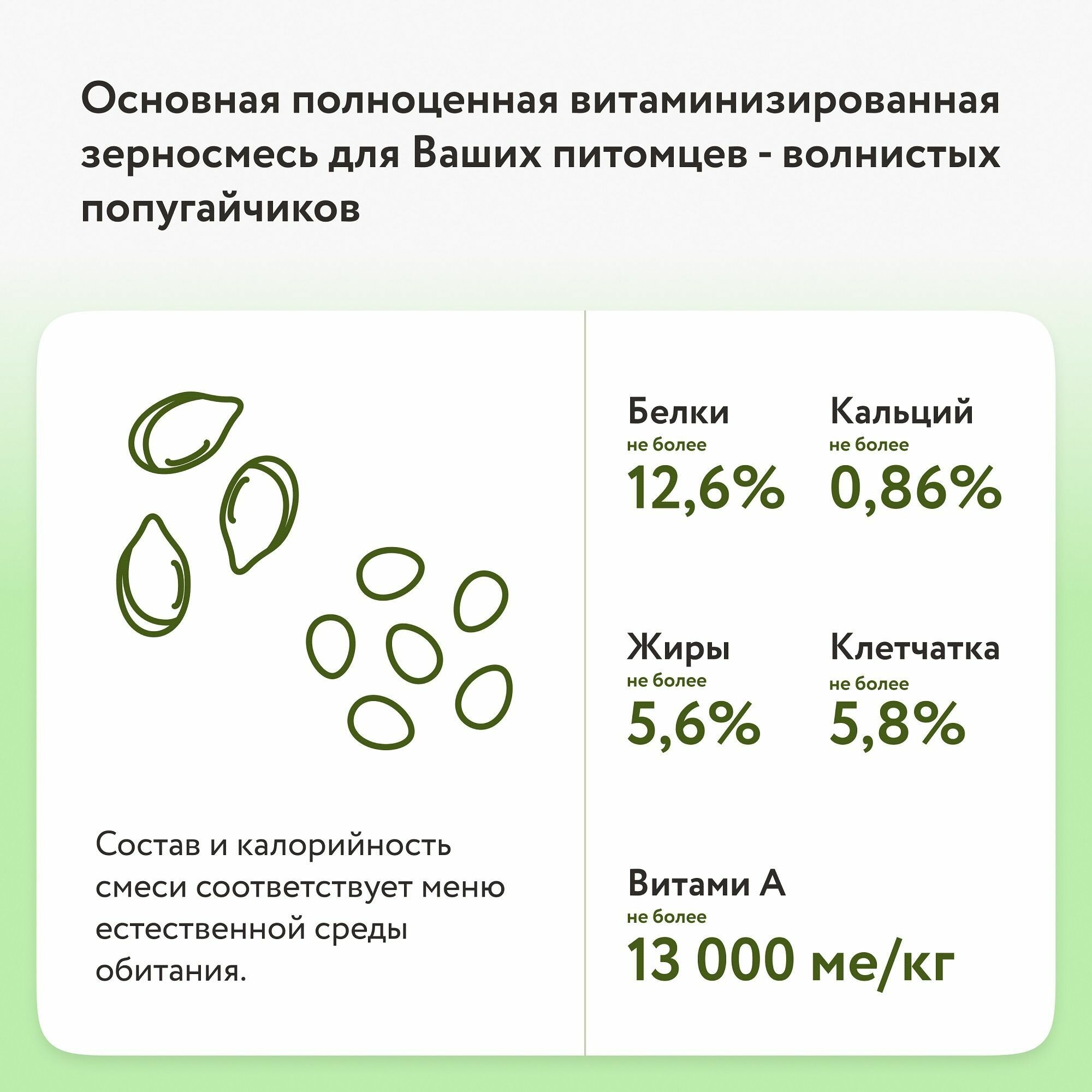 Им очень нравиться радостные после еды прыгают и летают по всей клетке Недостатки: Всего лишь 500гр и содержит конопляное семя Витаминизированная зерносмесь для волнистых ПОПУГАЙЧИКОВ просто класс |