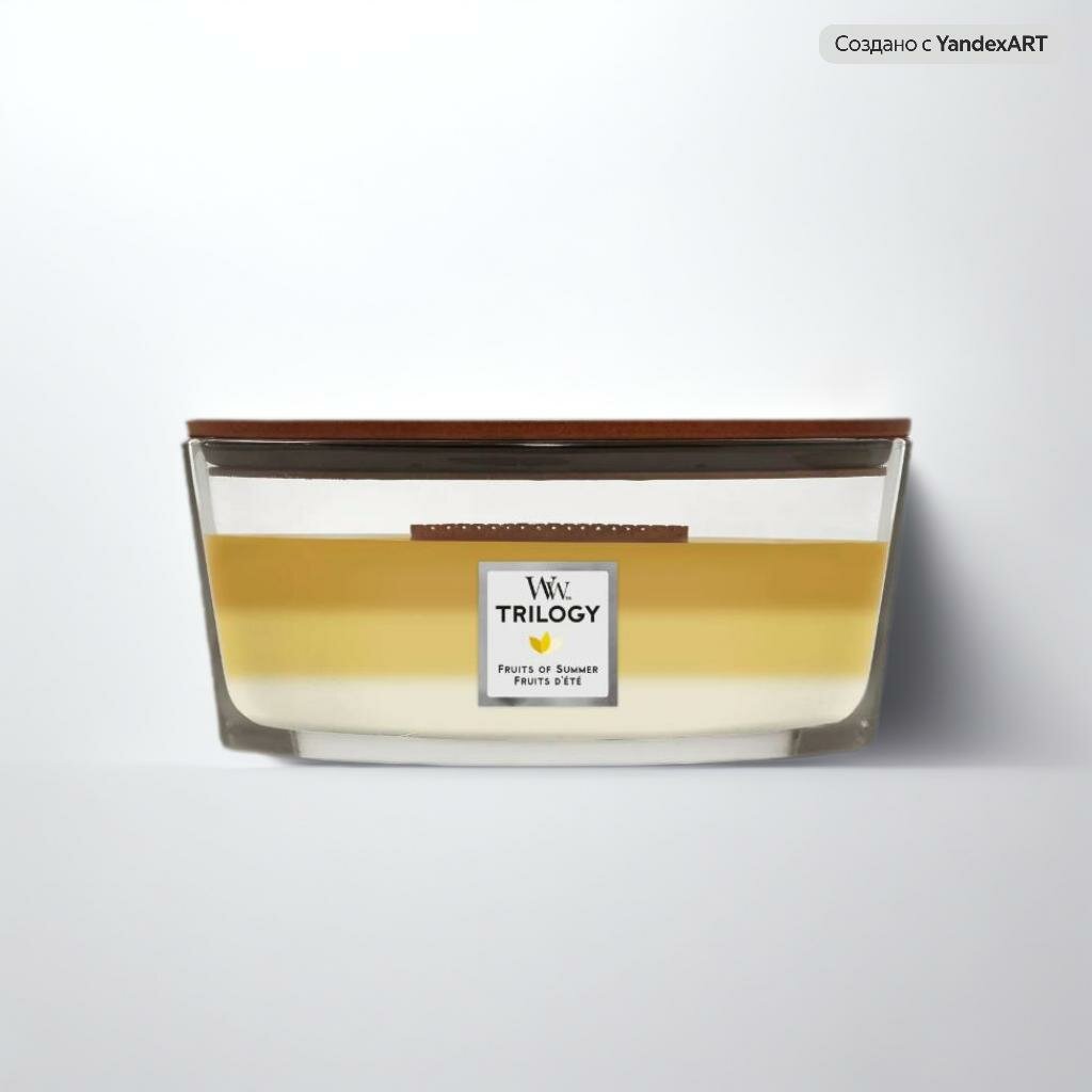 Свеча WoodWick Trilogy Fruits of Summer (Pineapple, Lemon, Coconut) (76958), эллипс желтый