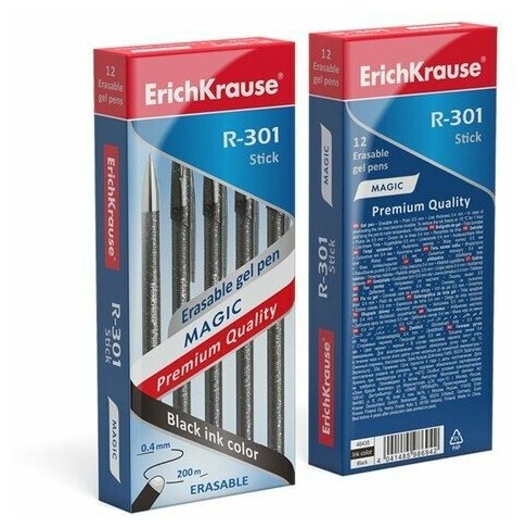 Ручка гелевая стираемая Erich Krause R-301 Magic Gel, узел 0.5 мм, чернила чёрные, длина письма 200 м, цена за 1 шт, 12 штук